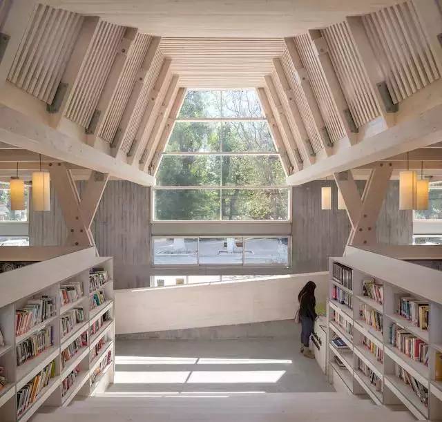 设计师把社区图书馆打造成一个占地 350 平方米、仅有一层的木结构建筑。