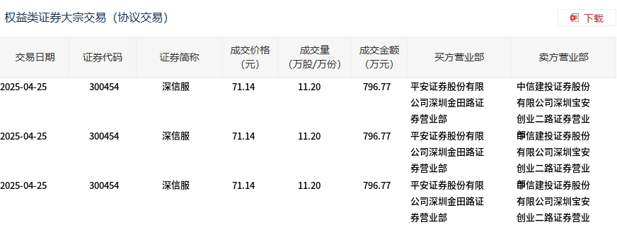 4月25日,深信服大宗交易成交33.6万股,成交额2390.31万元,占当日总成交额的1.93%,成交价71.14元,较市场收盘价94.89元折价25.03%。