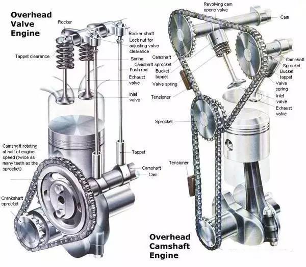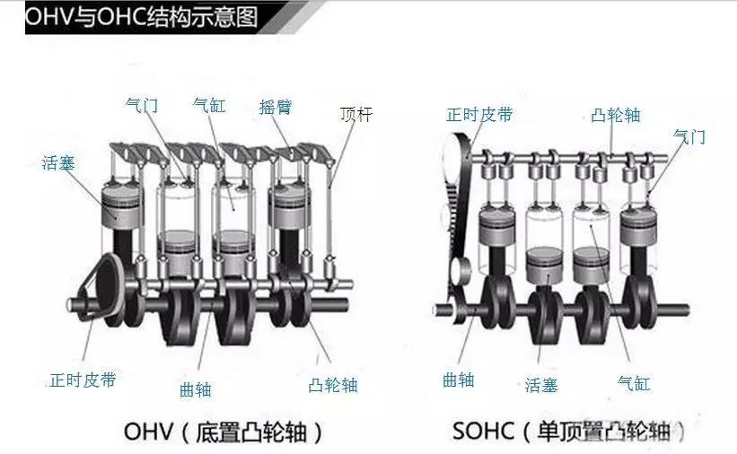 OHV即顶置气门,是比较传统和老式的气门结构,驱动气门的凸轮轴躲在发动机本体下端,依靠长长的顶杆推动本体上端的气门。
