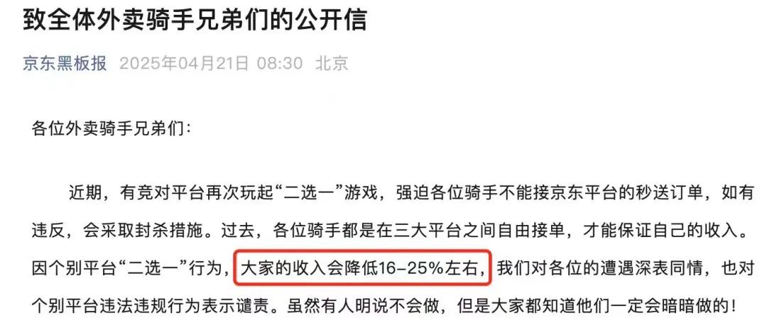 4月21日,京东发布《致全体外卖骑手兄弟们的公开信》,为遭遇“二选一”的骑手兄弟“声讨”。