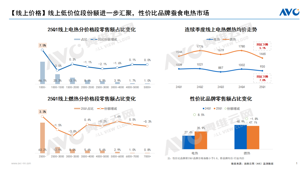 价格层面,2024年在国补政策的影响下,线下热水器市场价格提升显著,线上价格同比降幅也有明显收窄。进入2025年1-3月,线上热水器市场价格同比均呈现下行趋势,奥维云网(AVC)监测数据显示,2025年1-3月电热均价930元,同比下降7.8%;燃热均价1465元,同比下降5.1%,其中线上电热性价比品牌的持续扩张对电热价格长期走势产生影响(价格指数小于0.8,即品牌均价/行业均价),2025年1-3月电热性价比品牌零售额占比35.9%,同比增长8.5%。线下热水器市场则是在国补政策的持续推动下,价格结构持续上行,显示出线下市场的强劲活力。