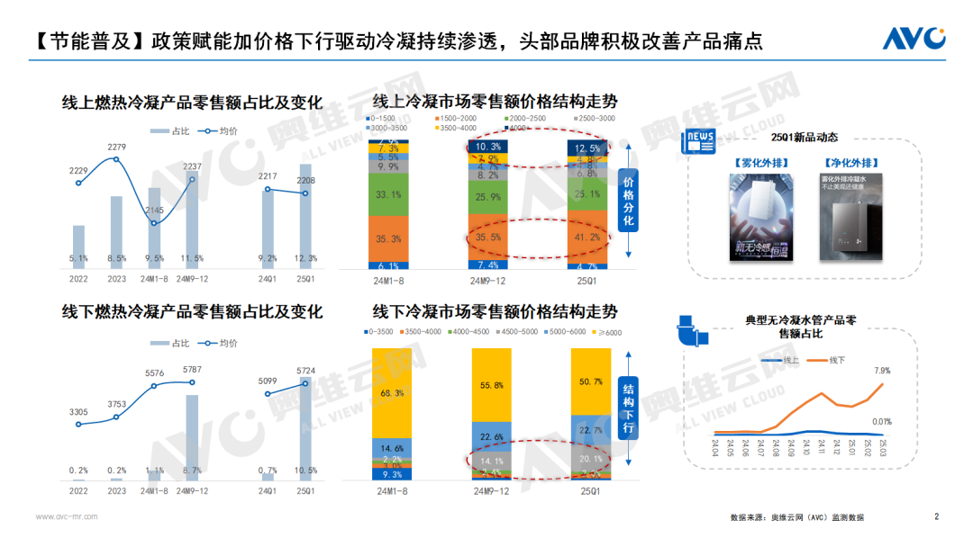 过去燃热冷凝产品因价格偏高、冷凝水管安装及使用不便等因素抑制了消费者的购买意愿,以旧换新国补政策的落地实施,有效激发了燃热冷凝市场,奥维云网(AVC)监测数据显示,2025年1-3月燃热冷凝产品线上零售额占比12.3%,同比增长3.1%,线下零售额占比10.5%,同比增长9.8%。政策背景下,一方面企业积极应对推出集水盒、无冷凝水管等创新解决方案;另一方面,随着众多品牌持续入局,产品线上及线下价格结构均呈下行趋势。
