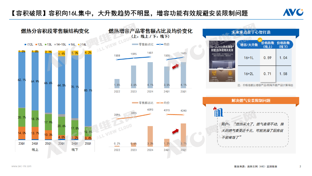 在产品参数方面,“内卷”态势依旧严峻,热水器市场亦如此,具体体现在燃热产品对增容、增压、静音功能的参数竞争上。从容积上看,燃热容积持续向16L集中,大升数产品趋势不明显,增容产品突破传统容积限制,相比16L产品具备更高使用灵活性,并有效规避安装限制问题,奥维云网(AVC)监测数据显示,2025年1-3月燃热增容产品线下零售额占比3.7%,同比增长2.5%,未来重点在于用户心智打造。增压和静音则反映了消费端对极致体验的追求,契合了当下消费者对高品质生活的向往。从一季度新品情况看,部分新品在静音性能上可低至32分贝,增压能力更是达到了行业领先的350%水平。