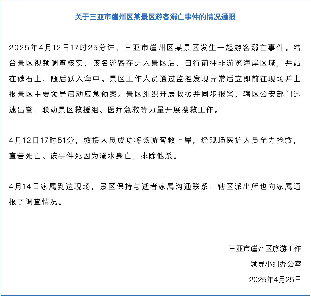 4月12日17时25分许,三亚市崖州区某景区发生一起游客溺亡事件。结合景区视频调查核实,该名游客在进入景区后,自行前往非游览海岸区域,并站在礁石上,随后跃入海中。景区工作人员通过监控发现异常后立即前往现场并上报景区主要领导启动应急预案。景区组织开展救援并同步报警,辖区公安部门迅速出警,联动景区救援组、医疗急救等力量开展搜救工作。