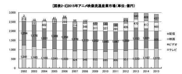 日本影像制品协会公布的《影像市场规模与观众动向调查报告 2016》指出,去年的影像制品规模达到了5258亿日元,比前年增长了2.4%。其中光碟的贩卖市场共2171亿日元,是前年的97.2%,租借市场共1831亿日元,为前年的94.3%。值得一提的是,随着相关服务中介商的增多,付费动画配信的市场规模进一步扩大,与前年相比达到了130.7%,共计1256亿日元。