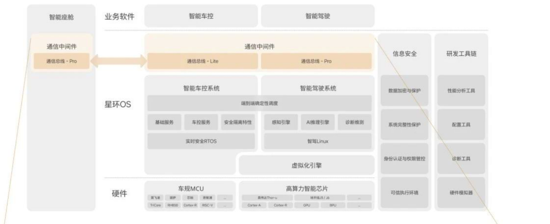 全域操作系统的好处,可以参考理想在车展前夕公布的星环OS的看法。全域系统最重要的价值在于打造智能汽车高效的数据交互通信平台,从而解决汽车中央式电子架构的数据毫秒级内确定性传输和通信主题(topic)与算力、存储空间有限的矛盾。换句话说,就是智能汽车在软件层面上,也要从原来的“分布式”变成中央式的架构。