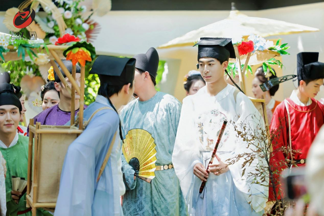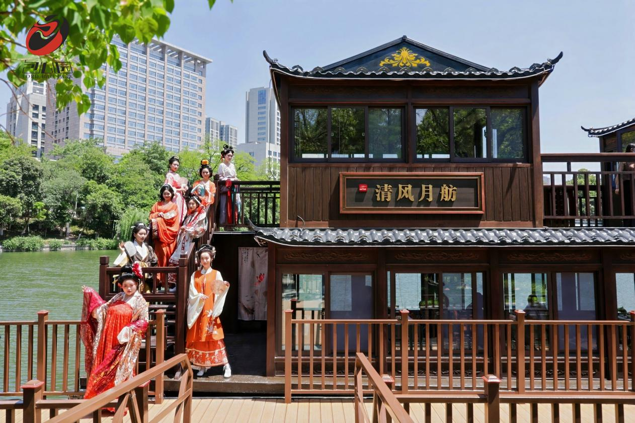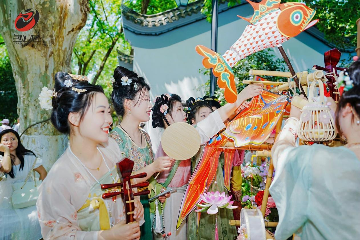 此外,景区常态化推出的古风市集,汇聚了文创、非遗等具有传统文化特色的业态;现场还提供汉服租赁服务,参与者可身着各色传统服饰,或执团扇于花间驻足,或提灯沿小径徐行,通过赏景、抚琴、品茗等雅致场景,生动展现传统美学的现代表达。这一系列活动既为游客提供了沉浸式的文化体验,也为传统服饰文化的推广搭建了展示平台。