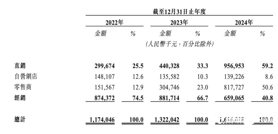 从数据来看,2022-2024年,直销渠道贡献的营收从25.5%增长至59.2%,其中来自零售商(即直销渠道中,企业与外部合作的零售主体)的收入分别为1.5亿元、3.05亿元及8.2亿元,分别占相关年度总收入的 12.9%、23%及50.6%。