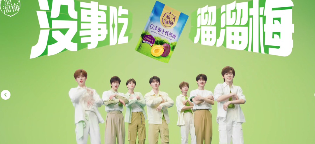 随着消费主力军向Z世代迁移,溜溜梅果断切入饭圈经济赛道。2021年签约顶流明星肖战,成功撬动泛娱乐圈层;2023年底牵手时代少年团,精准狙击00后消费群体,代言人选择上走出了一条精准的“顶流”路线。