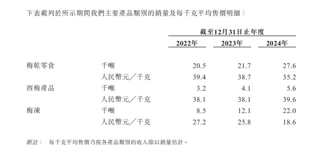 过去三年,核心品类梅干零食、梅冻的均价持续走低,尤其是2024年,梅冻价格同比大幅下跌27.91%,直接导致毛利率在去年出现下滑,同比下跌了4.1个百分点至36.0%。