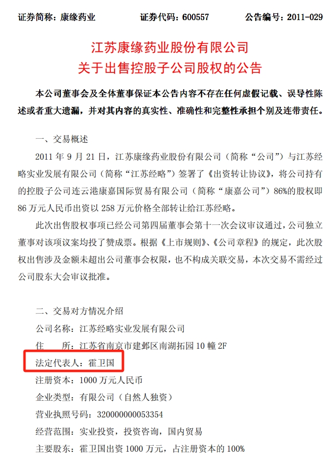 毅琛投资由自然人霍卫国100%持股。早在2011年,康缘药业曾披露过一笔出售子公司股权的交易,公司将所持有的控股子公司连云港康嘉国际贸易有限公司86%的股权转让给了江苏经略实业发展有限公司。彼时,江苏经略实业发展有限公司的法人即为霍卫东。