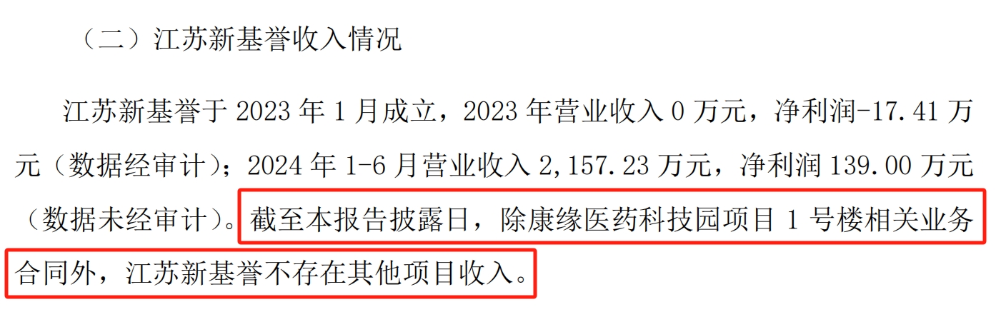 很快,康缘药业的关联交易引起了监管方面的关注,上海证券交易所发去了监管工作函。康缘药业对监管函的回复显示,截至公告之日,除与康缘药业的相关业务合同外,江苏新基誉不存在其他项目收入。