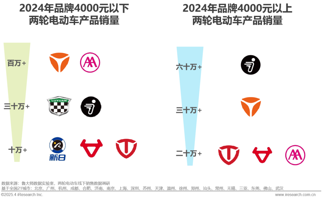 价格区间分化:4000元以下市场由传统品牌雅迪、爱玛主导;4000元以上高端市场由九号领跑,连续两年销量第一。