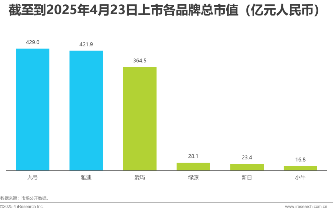 资本表现:截至2025年4月,九号以429亿元市值居上市公司首位,雅迪(421.9亿元)紧随其后,行业集中度进一步提升。