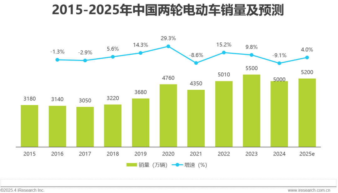 2024年,新国标《电动自行车安全技术规范(GB 17761-2018)》已全面落地,替换潮购买车辆还未到换车周期,市场回归常态替换状况,加之2018年新国标规范下的两轮电动车不能很好的满足用户长续航、强动力需求,导致用户换车需求降低,市场销量下滑,全年销量约为5000万台。2024年底国家颁布新国标《电动自行车安全技术规范(GB 17761—2024)》,对车辆重量、电机扭矩给出新标准,满足了用户需求,加之以旧换新补贴,预计2025年会迎来新一轮增长,但在消费降级的大背景下,预计增速有限,预估全年销量为5200万台。