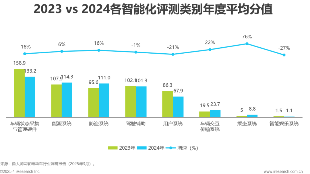 对比2023年,2024年8大系统总分降低2.6%,智能化配置呈现结构分化,部分功能投入收缩明显,核心系统升级仍在推进。其中,乘坐系统增加76%、车辆交互传输系统增加22%,显示整车与人、车、平台之间的连接功能加快强化。防盗系统和能源系统的增加表明安全保障与续航效率成为智能系统优化重点。相比之下,智慧娱乐系统下降27%,短期内仍属非刚需选项。用户系统和车辆状态管理分别下降21%和16%,说明非核心体验型配置的投入有所调整,或面临整合替代。