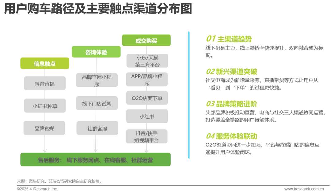 渠道布局正在以线下经销体系为主的传统模式,逐步拓展为多元融合的新格局。除主流电商平台外,短视频平台、小红书等内容型渠道也成为重要流量入口。电商、社交、直营等新兴渠道渗透率持续提升,“线上种草+线下取车”成为主流购车路径之一。头部品牌积极构建自营商城与O2O交付体系,推动用户体验从购买前到售后服务的闭环升级。