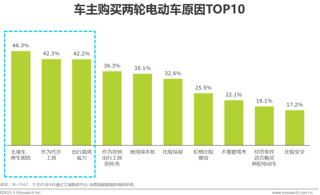 从调研数据上看,用户选择两轮电动车的首要动因集中在出行效率与日常代步便利,高效省力和作为家庭出行补充等功能型需求也占据前列,凸显用户对电动车实用性的强依赖。相比之下,成本低,环保和价格便宜等经济性原因虽有一定占比,但重要性相对次要。安全和驾考门槛低等因素占比低说明当下驱动用户决策依然以功能效率为首要考量。