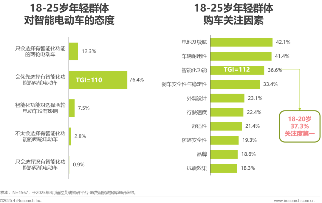 在选购电动车时,18-25岁群体会优先选择有智能化功能能的两轮电动车,占比76.4%,相比总体显著性更高,TGI=110;在购车时除电池续航、耐用性等必备条件外,智能化功能的关注度较高,TGI=112,其中18-20岁群体首先关注智能化功能。