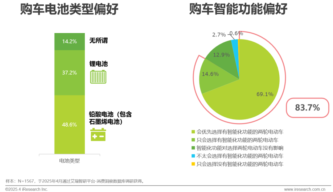 在电池类型方面,近5成用户考虑购买铅酸电池(包含石墨烯电池),近4成用户会选择锂电池,少部分用户对电池类型没有偏好;83.7%的用户在购车时会优先选择具备智能化功能的两轮电动车,其中14.6%的用户只会考虑具备智能化功能的两轮电动车;12.9%的用户对智能化功能没有偏好,少部分用户会选择不具备智能化功能的两轮电动车。
