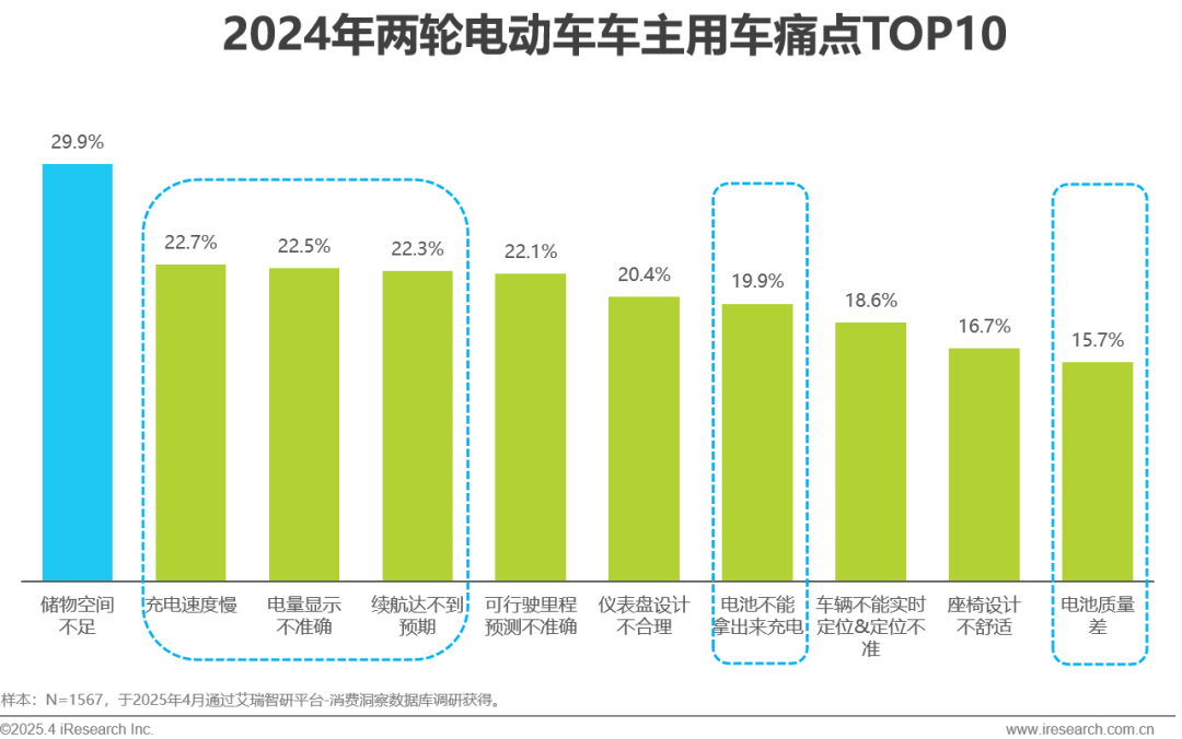 调研结果显示,储物空间不足仍然是当前使用中最突出的问题。同时,围绕续航与电池的多个问题也排名靠前,说明用户对出行可靠性仍有较高期待。尽管目前智能化广泛应用,但相比智能化体验,交互流畅性与稳定性仍然是用户关注的焦点。整体来看,未来产品设计应在提升基础出行性能的基础上,优化智能化体验细节,以增强用户的满意度和复购意愿。