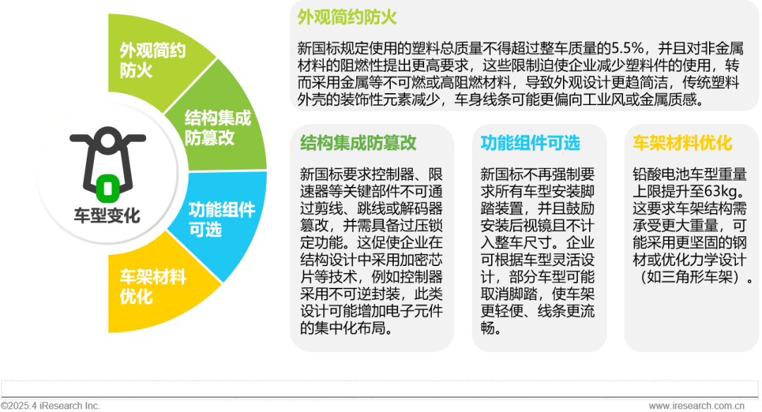 新国标通过材料限制、防篡改要求、功能模块集成等多维度规定,推动两轮电动车设计向更安全、集成化、智能化方向发展。外观上,车辆趋向简洁实用,金属材质占比提升;结构上,电池和电子元件的封装技术、车架力学设计、防火阻燃层的应用成为关键。这些变化既是对行业乱象的规范,也为技术创新和差异化竞争提供了空间。
