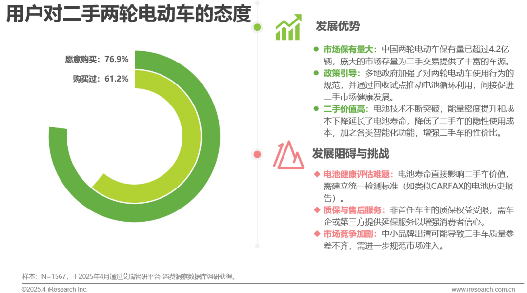 大部分用户愿意购买二手两轮电动车且6成以上用户购买过二手两轮电动车,在政策支持、技术革新和商业模式创新的推动下,二手市场有望成为行业增长的新引擎;未来,若能在电池检测标准化、质保体系完善等方面取得突破,二手交易渗透率或将显著提升。