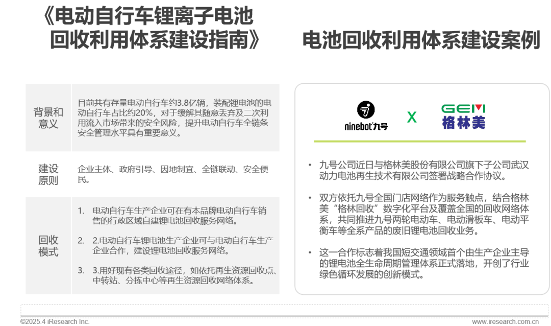 锂电池的使用寿命通常为3至5年。若超期使用而未及时更换,电池容量和性能会显著下降,甚至可能引发热失控或爆炸等安全风险。然而,长期以来,锂电池的回收渠道并不完善,许多用户选择将“退役”电池出售给个人或小作坊。这种非正规的回收方式不仅容易造成环境污染,还可能导致不合格的二次改装电池流入市场,进一步增加充电起火或爆炸的安全隐患。《电动自行车锂离子电池回收利用体系建设指南》和《电动自行车行业规范条件》明确了有关回收利用的方向。2024年,九号公司与格林美旗下开展合作,规避二次改装电池流入市场带来的安全隐患,为两轮电动车行业“向绿”发展再添助力。