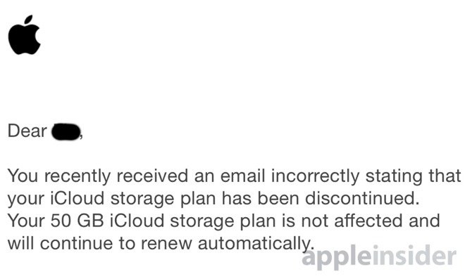 4月22日,苹果官方对用户发出了道歉声明,“你们最近收到了不正确的邮件,称iCloud存储产品已经取消,相关50GB存储的产品并未受到影响,将会自动延期。”