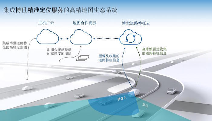 此外,通过数以百万计的配备博世毫米波雷达及摄像头的量产车辆,可以实现众包数据采集,定位特征提取,并上传至地图供应商的符合国家安全要求的云端服务器,从而满足高精地图对及时性和低成本性的需求。