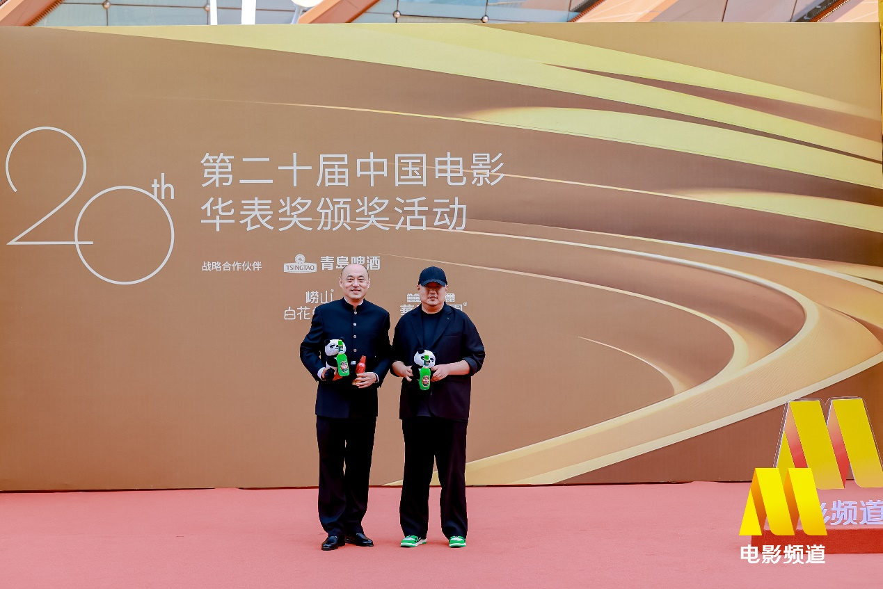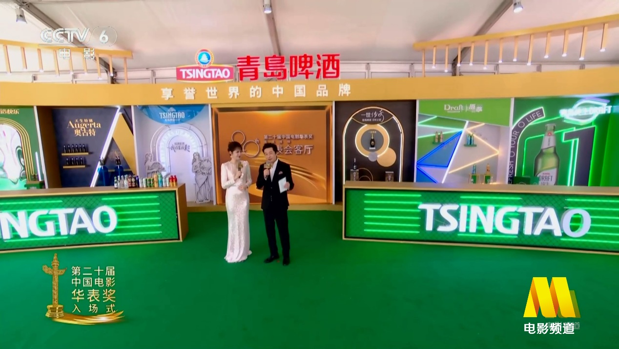 百米红毯两侧,青岛啤酒logo灯箱与青岛啤酒手举牌交相辉映,甚至有嘉宾举着青岛啤酒就走上红毯,让星光熠熠的华表奖红毯,多了烟火气的“松弛感”。而主持人更是现场“安利”红毯嘉宾,来青岛团建“喝青岛啤酒”。