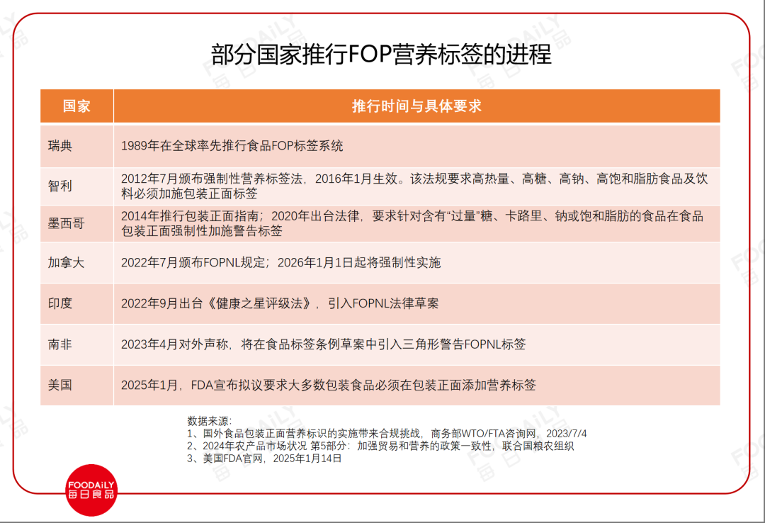 FOP在食品包装正面以图形+文字或其组合的形式,提供关于食物的整体营养价值或关键营养成分信息。1989年以来,世界上至少有40个国家推行FOP标签。2023年,世卫组织在发布的《全球营养标签指南》中将FOP列为最佳实践。在全球潮流的影响下,美国FDA在今年1月也提出倡议,要求大多数包装食品在正面添加营养标签。