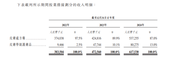 从公司财务状况来看,2022年-2024年期间,德镁医药的营业收入分别为3.84亿元、4.73亿元和6.18亿元,三年累计营收近15亿元,年均复合增长率达到26.89%,显现出稳健的增长趋势。对于营收的持续增长,德镁医药在招股书中指出,主要得益于皮肤处方药和皮肤学级护肤品销售的提升。
