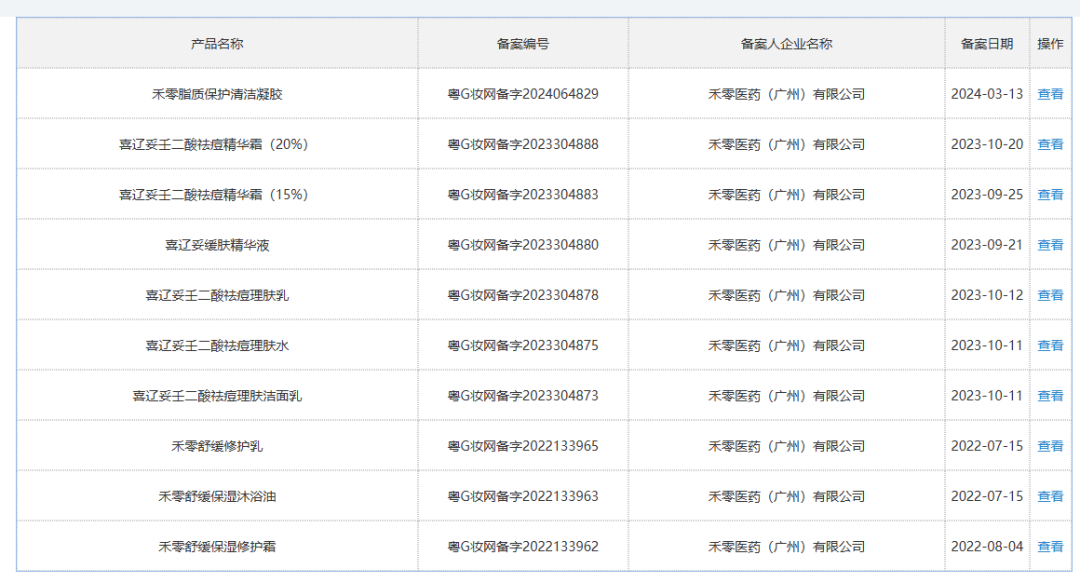 国家普通化妆品备案信息系统显示,禾零医药备案了4款禾零舒缓系列产品和6款喜辽妥壬二酸祛痘系列产品。然而,从备案日期来看,大多数产品的备案时间集中在2022年和2023年,2024年仅有一款产品完成备案,今年尚无产品完成备案。