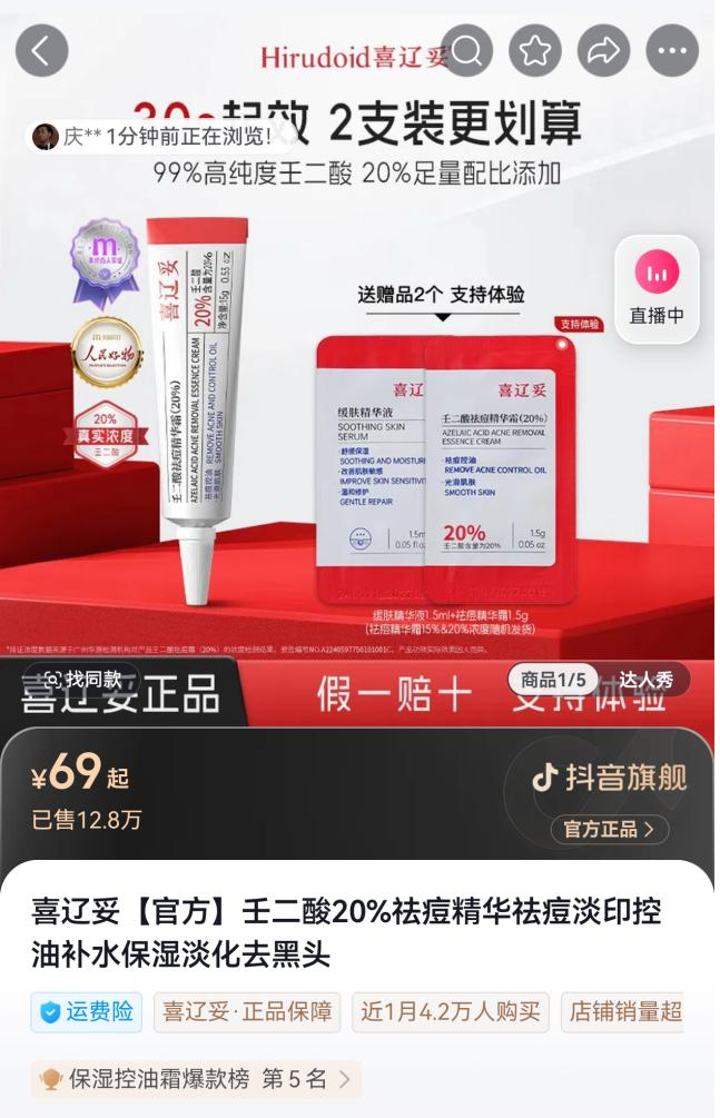 而截至2025年4月26日,喜辽妥在抖音的GMV翻了近10倍,在1000万-2500万之间。其中,喜辽妥壬二酸20%祛痘精华的单链接GMV就在500万-750万之间,同时,该款产品还登上抖音保湿控油霜爆款榜。