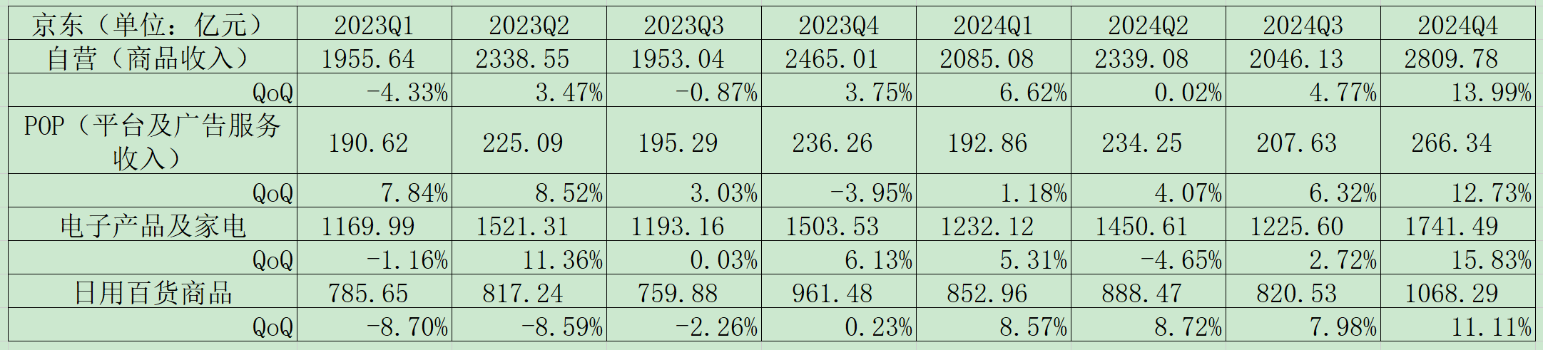 在2024年的各个季度数据中(除了电子产品及家电业务的Q2数据之外),无论是商品收入和平台及广告服务收入,还是电子产品及家电收入和日用百货收入,均呈现同比正增长的情况,全年的数据表现也开始企稳。