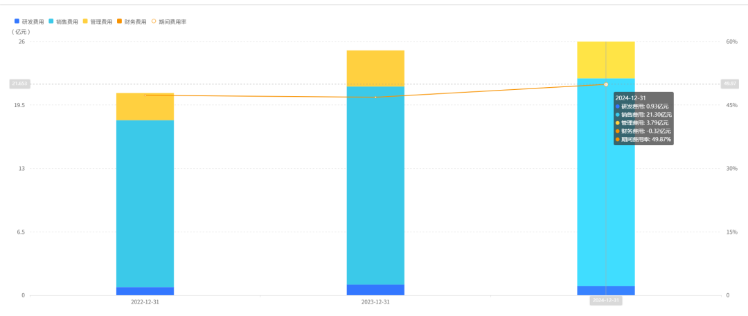 根据财报,报喜鸟2024年投入费用达25.7亿元,约为全年营收的1/2,同比增长4.45%。其中,销售费用、管理费用均有所增加,销售费用更高达21.30亿元,占营收超四成。但营销效果不尽如人意,最终表现略显遗憾。