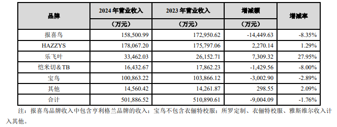 数据显示,在集团各品牌中,包括主品牌报喜鸟在内的多个品牌收入出现下滑;收入占比最大的代理韩国品牌HAZZYS(哈吉斯),年内仅微增1.29%;代理自法国的户外品牌乐飞叶成为两位数增长独苗。