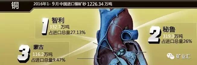2016年,中国进口铜矿砂及其精矿1696万吨,与去年同期相比增长28.2%,其中前九个月进口1226.34万吨,智利和秘鲁是中国铜进口主要来源国,1-9月分别进口332.7万吨、319.3万吨,两国共占中国进口铜矿53.13%。
