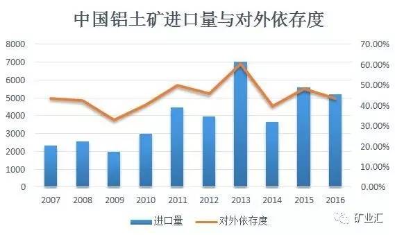 2016年,我国共进口铝土矿5178万吨,同比下降7.24%,但仍维持5000万吨以上水平,对外依存度长期在45%左右。随着国内矿石品级下降,中国使用进口矿石的氧化铝产出比例预计在2030年将提升至60%。