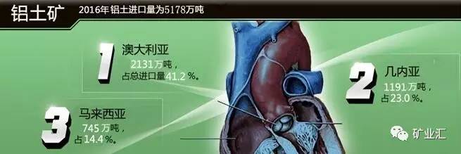 澳大利亚、几内亚、马来西亚是中国进口铝土矿的主要来源国,2016中国从上述三国共进口铝土矿4067万吨,占总进口量的78.54%。