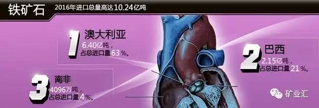 相对于其他矿种,铁矿石来源的垄断有过之而无不及,2016年,中国从澳大利亚、巴西进口铁矿石量占进口总量的84%,其中,中国进口澳大利亚铁矿石6.40亿吨,占总进口量的63%。