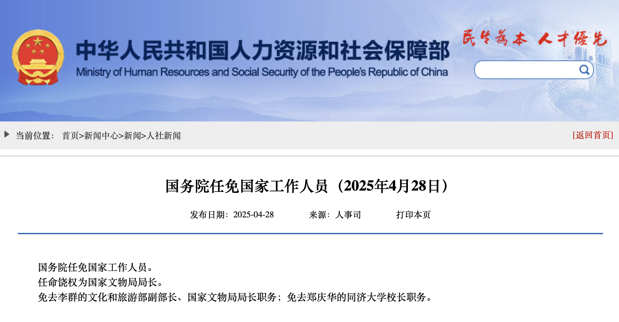 据人社部网站4月28日消息,国务院任免国家工作人员。