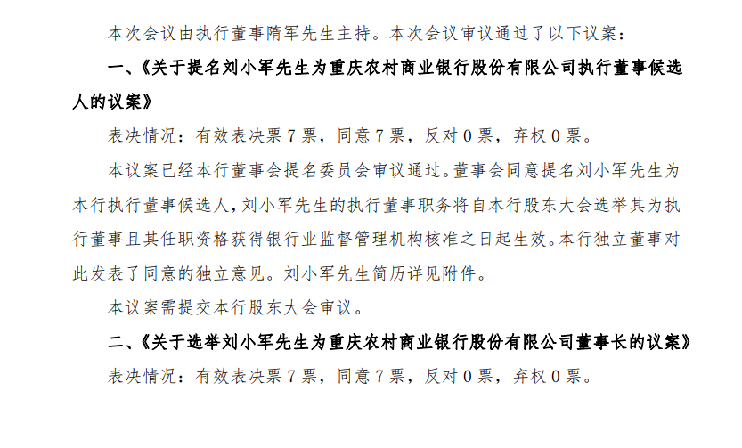 4月16日,重庆农商行公告称,董事会提名刘小军为执行董事候选人,选举刘小军担任本行第五届董事会董事长。