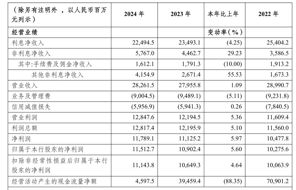 2024年,该行实现营业收入282.62亿元,同比仅增长1.09%。