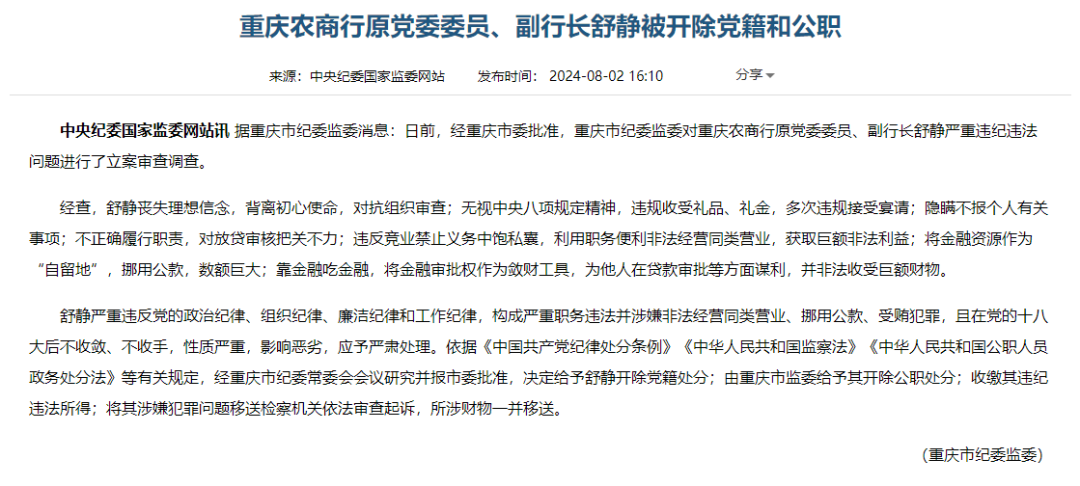 2024年3月28日,重庆农商行董事会决议解聘舒静副行长职务。在她被解聘后的第二天,据重庆市纪委监委发布消息,舒静涉嫌严重违纪违法,正接受市纪委监委纪律审查和监察调查。2024年8月2日,舒静涉及7项违法违规行为,被开除党籍和公职。