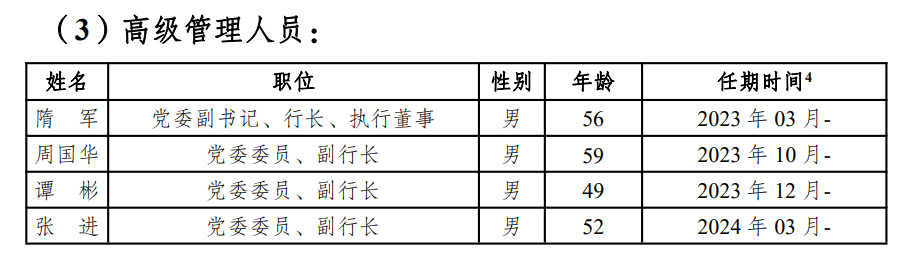 公告显示,从2024年1月至今该行副行长职位两进三出。其中,新聘任谭彬、张进任副行长,张培宗、董路卸任,舒静被解聘;董路因工作调动2024年1月起不再担任副行长。