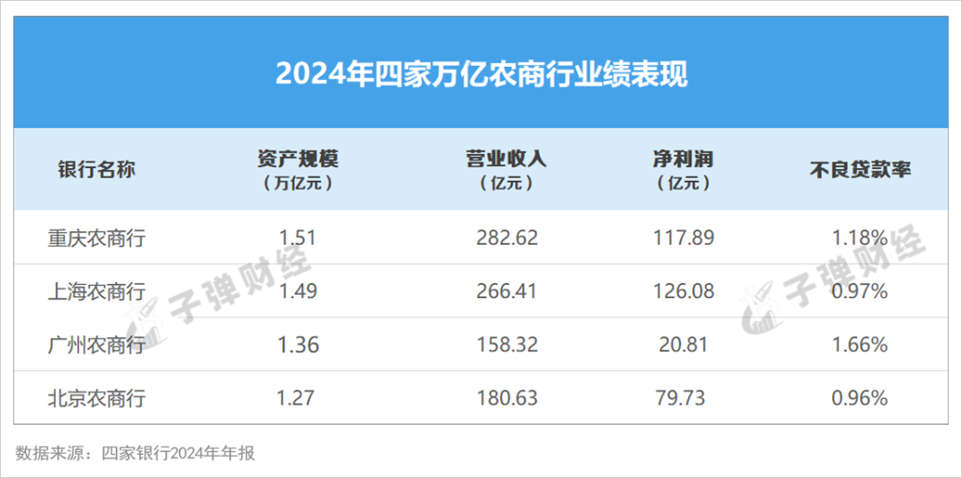 广州农商行总资产规模1.36万亿元,在四家银行中排名第三。北京农商行资产规模1.27万亿元,不良率下降至0.96%,资产质量优于其他三家。