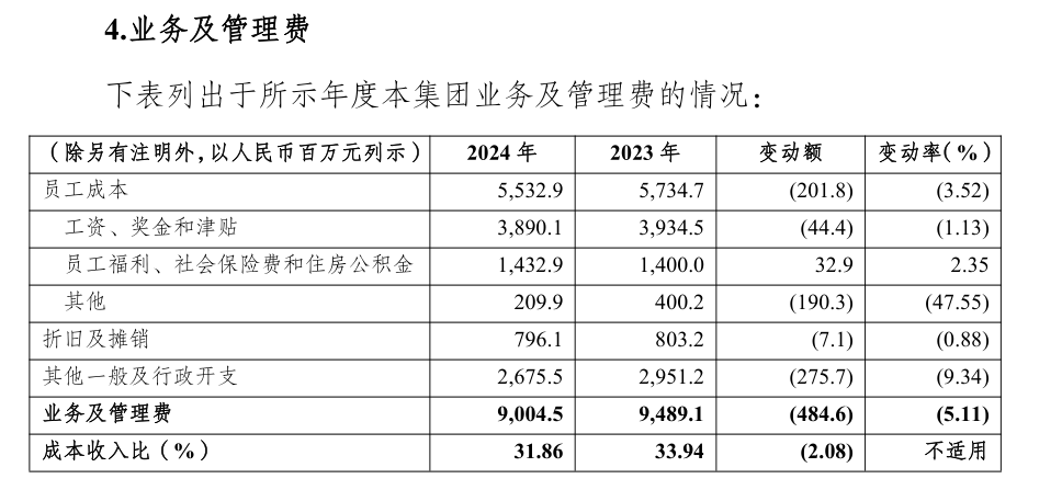年报显示,2024年重庆农商行业务及管理费为90.05亿元,同比减少4.85 亿元,降幅5.11%。