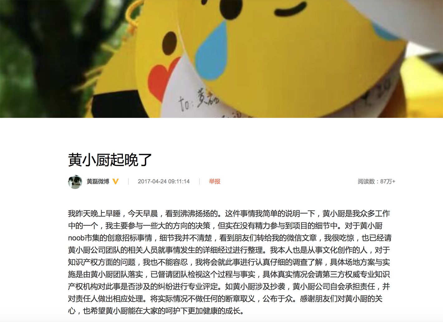 文中描述了黄小厨noob市集使用了并没有中标的创意方案,对比了现场图以及该公司的设计图,相似度90%以上,公关公司称“一切都是熟悉的味道”。当其试图与团队联系并索取策划费用时,得到了“首先我要声明的是我们没有使用任何你们的创意,所有方案都是我司同事与现在与我司合作的公关公司共同制定的”的回复。该公司表示要正当维权,虽然钱可能要不回来,但绝不会放弃方案的知识产权。